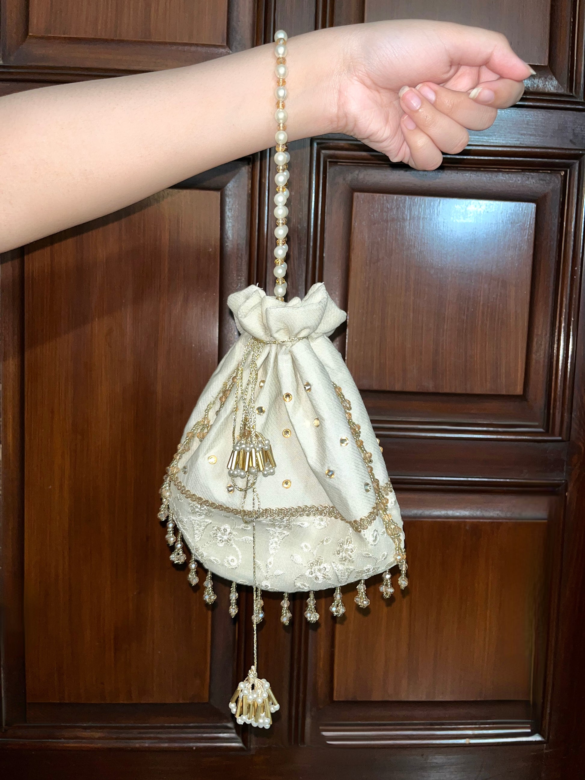 The Ivory Elegance bag is a vision of grace, crafted to perfection for those who adore classic charm. Made from soft ivory fabric with exquisite lace detailing, this handcrafted potli is adorned with golden accents, intricate embellishments, and delicate pearls that elevate its luxurious appeal. The beaded handle adds a touch of vintage royalty, making it an ideal companion for wedding festivities, formal gatherings, or special occasions. With its fusion of traditional Pakistani craftsmanship and modern sophistication, this bag is designed to make a lasting impression.
